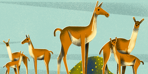 Los guanacos son mamíferos nativos de Sudamérica. Son los camélidos más grandes de Sudamérica. Tienen un pelaje grueso y marrón claro. Son parientes de las llamas, tienen patas largas y se alimentan de plantas. Son parte importante de la dieta del puma.Cuando se sienten en peligro, realizan sonidos que alertan a toda la manada.